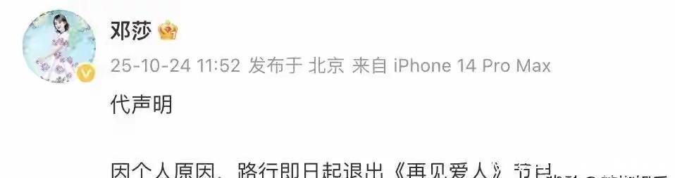 风波发酵后连锁反应显现:10月17日路行辞任创联控股执行董事及主席,10月24日邓莎代发声明称其因“个人原因”退赛。原定播出的《再见爱人5》第二期推迟上线,而复播后两人镜头却被大幅删减。